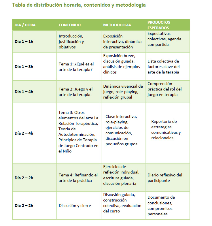 El curso responde a la necesidad de rescatar el “arte” de la terapia como complemento de la ciencia, destacando la importancia del juego, la relación terapéutica y la autodeterminación en la práctica clínica. Su valor radica en ofrecer un espacio de aprendizaje vivencial que conecta teoría, práctica y reflexión personal.